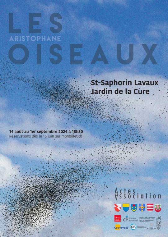 Du 15 août au 1er septembre, le Jardin de la Cure de Saint-Saphorin accueille une utopie comique intemporelle : Les Oiseaux d’Aristophane. Deux amis, Belespoir et Ralliecopain, fuient le tumulte du monde avec l’espoir de découvrir un monde meilleur. Leur rencontre avec la communauté des oiseaux, qui mène une vie simple et joyeuse, les conduisent à fonder, avec eux, une cité idéale entre terre et ciel. Une entreprise convoitée par une multitude d’empêcheurs de rêver aussi drôles que désagréables.