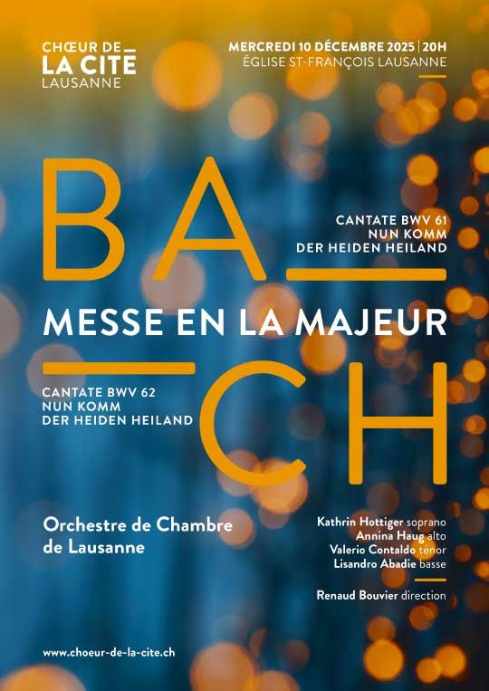 Pour ses 50 ans le Chœur de la Cité de Lausanne donnait en mai 2023 à l’église Saint-François le Magnificat et l’Oratorio de l’Ascension de Bach avec l’Orchestre de Chambre de Lausanne. Cette magnifique expérience fut vécue avec bonheur tant par les choristes ou les solistes que par l’orchestre. Le chœur, les solistes et l’orchestre lausannois se donnent donc à nouveau rendez-vous en décembre 2025 pour entonner deux Cantates de l’Avent et la Messe en la majeur du grand musicien. Chanter Bach, surtout dans ces œuvres de force et de jubilation, est une pratique qu’un chœur comme celui de la Cité de Lausanne aime vivre le plus régulièrement possible.
