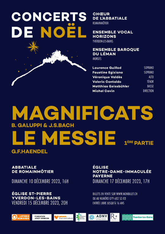 Le Chœur de l’Abbatiale Romainmôtier, l’Ensemble vocal Horizons et l’Ensemble baroque du Léman présentent leur concert de l’Avent, avec le Magnificat en sol majeur de Baldassare Galuppi, le Magnificat en ré majeur de Jean-Sébastien Bach et la première partie du Messie de Haendel.
