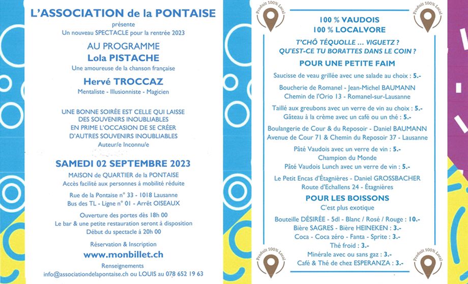 L’Association de la Pontaise (ADLP) présente son nouveau spectacle d’automne à la Maison de Quartier de la Pontaise, à Lausanne.