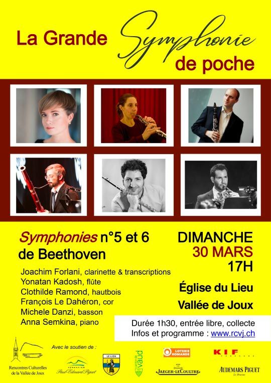 Les Rencontres Culturelles de la Vallée de Joux présentent La Grande Symphonie de poche : le Destin et la Pastorale, les 5e et 6e symphonies de Beethoven arrangées pour quintette à vent et piano.