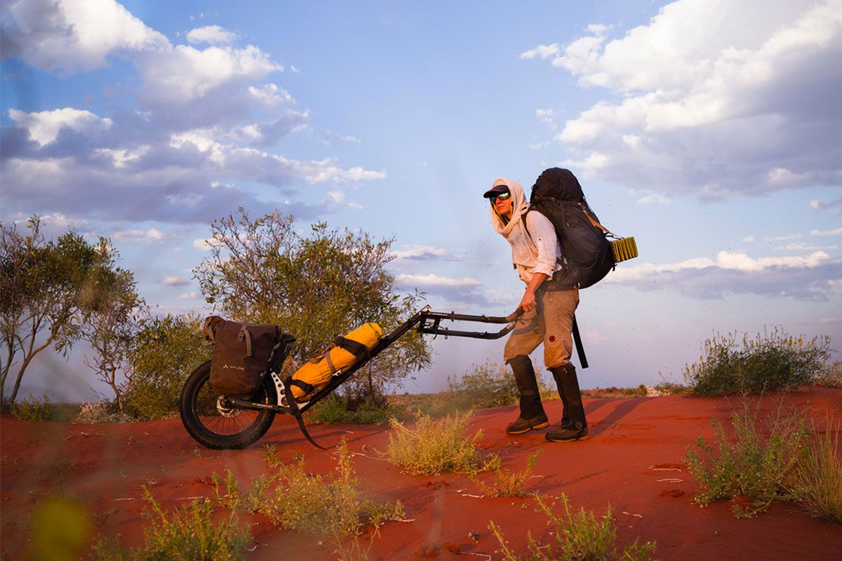 Avec 60 kg dans sa charrette et 22 kg dans le dos, elle affronta les dunes, le manque d’eau, de nourriture, les tempêtes, le froid, les chameaux et les dingos qui ne manquaient pas de la suivre lors de ses sessions nocturnes imposées. Mais toujours avec l’univers à ses cotés qui lui fera des cadeaux…