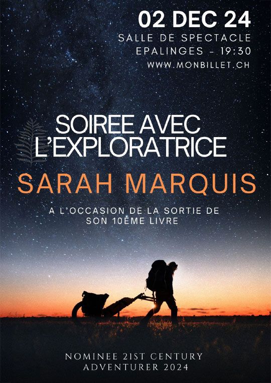 Cette soirée est l’occasion d’un moment unique de partage avec Sarah Marquis, riche en émotions et en découvertes. Son nouveau livre L’Étincelle du désert sera disponible ce soir-là, en dédicace.