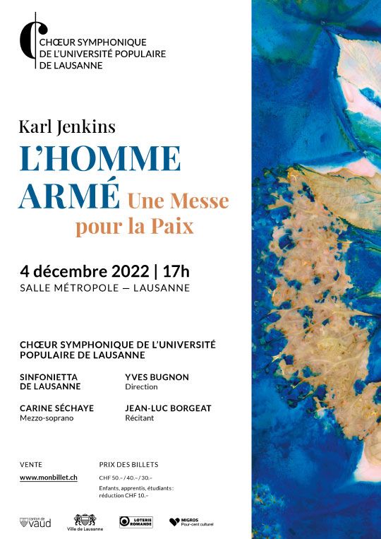 Le chœur symphonique de l’Université Populaire de Lausanne accompagné de l’orchestre Sinfonietta de Lausanne présentent L’Homme armé, Une Messe pour la Paix de Karl Jenkins.